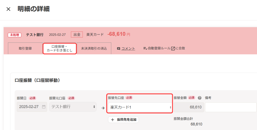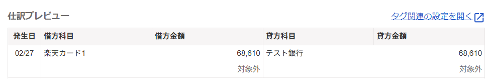 となることをご存じの方は少し混乱してしまうかもしれませんが、上記の手順で操作をすれば、「楽天カード1の利用額がテスト銀行から引き落とされた」という意味の仕訳となります。