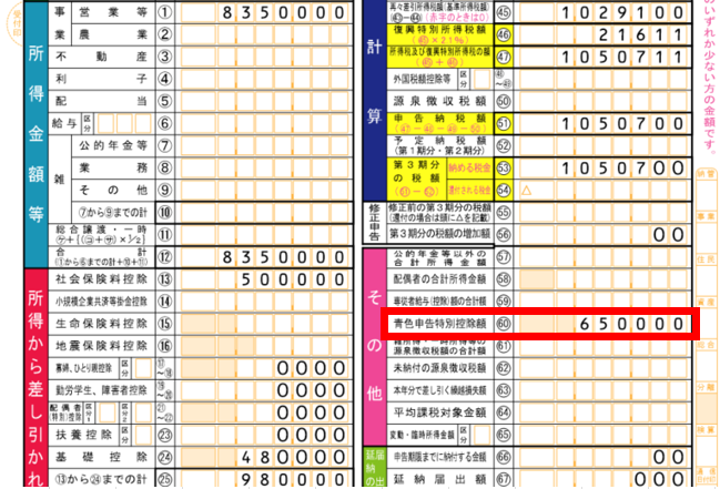 下画像の赤枠で囲まれた、青色申告特別控除額の金額を確認してください。