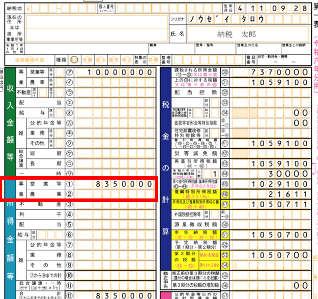 下画像の赤枠で囲まれた、事業所得の金額を確認してください。